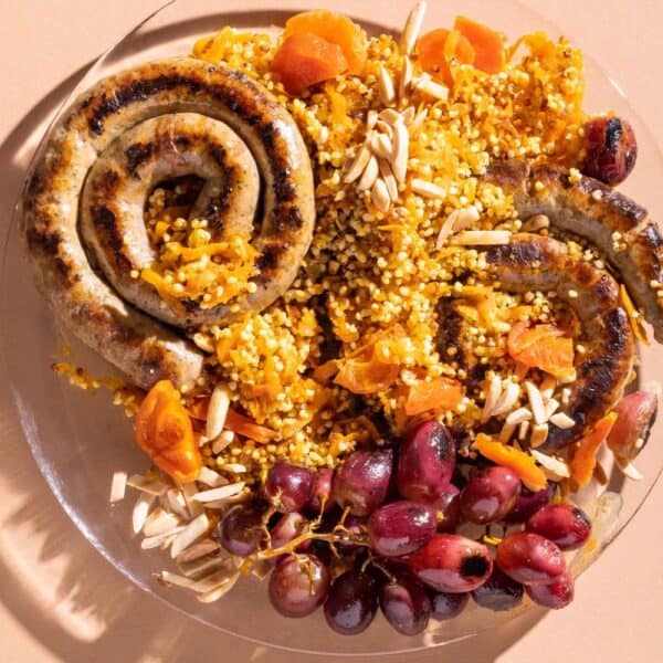 - Dish onto a serving platter and serve with the grapes and sausages.